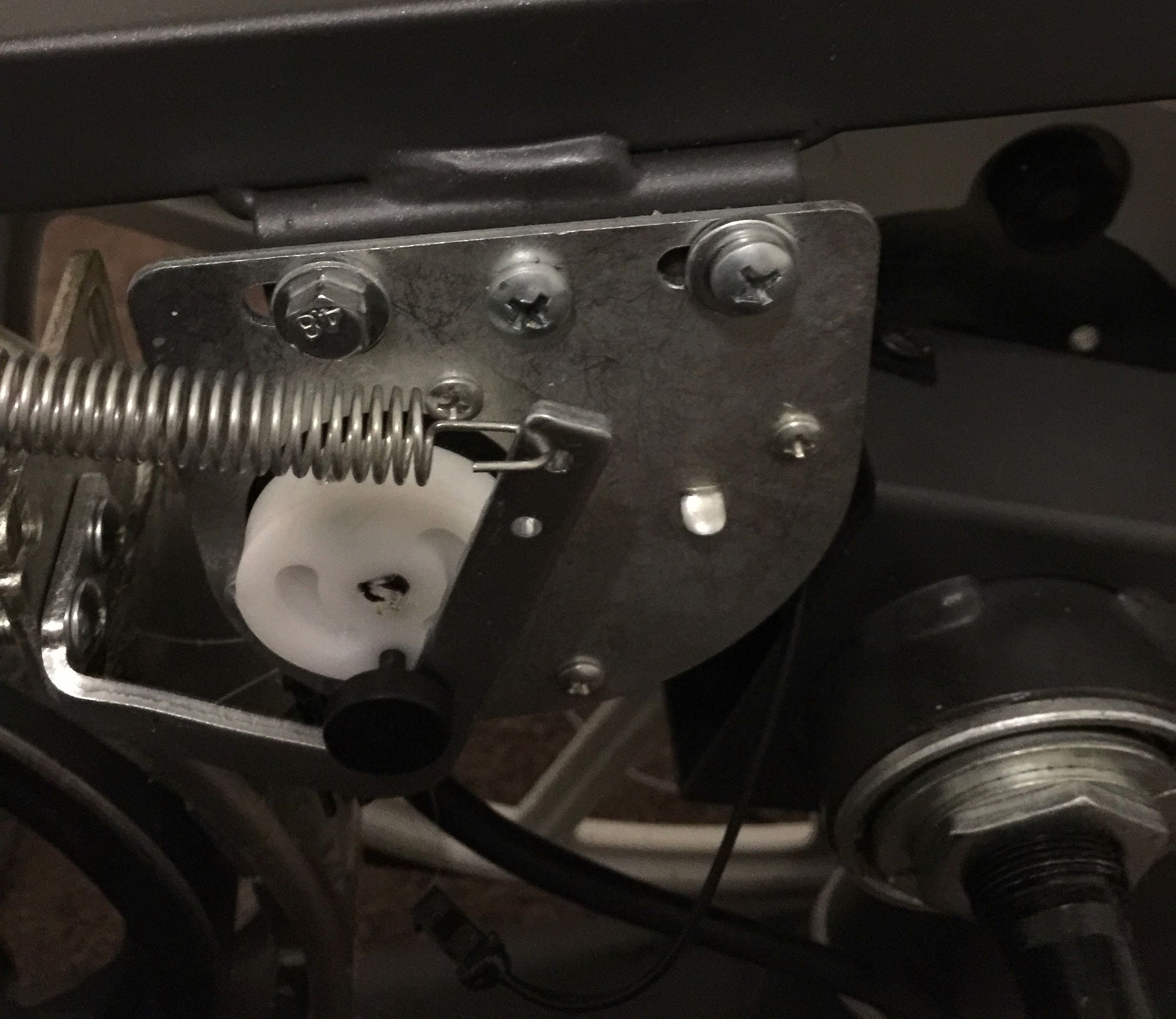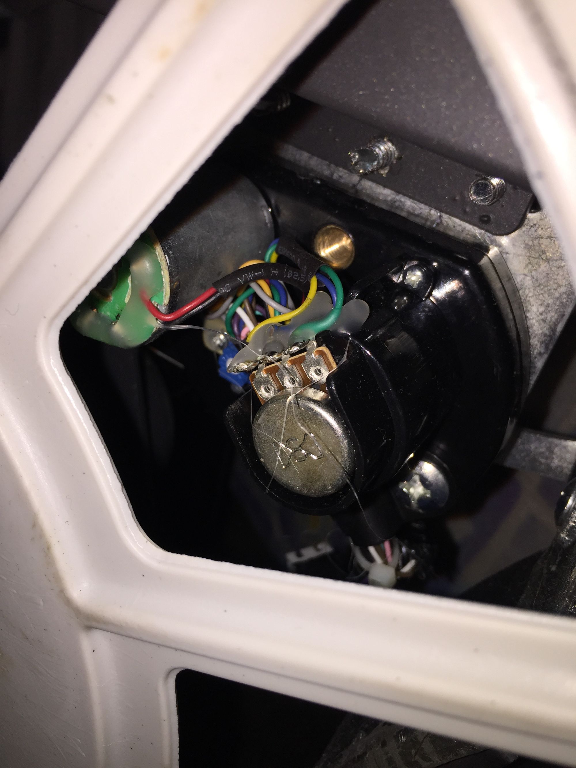 My first thought was, cool, a servo... and... a motor? When I looked up a servo they had 3 input pins just like this so I figured that yes this is indeed a servo. But after more research a photo caught my eye. Before I know it I was knee deep in a blog post from Joe Pitz titled Analog Fix for Nordic Track Exercise Bike. Although our bikes varied a lot, the core mechanics here were identical. That thing with three pins that I called a servo is actually a potentiometer. I should have noticed, it looks identical to the one that came with my Arduino. But again, this makes perfect sense. The computer unit attached to the bike does not adjust motor forward two steps, it goes until the pot reads a certain value so it knows it is in the correct place. I connected the multimeter up to the pot and found it to most probably be 5K-Ohm. I connected the motor to a 5V power source and hooked up my multimeter to measure the resistance. This will come in handy later.